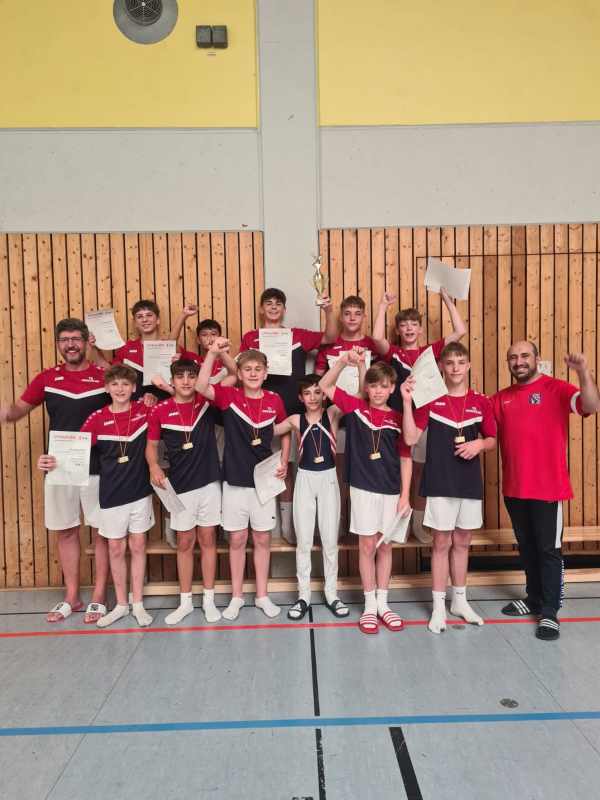 Mit 183,24 Punkten bestätigte die TG-Riege ihre bisherige Leistung eindrucksvoll. Mit einem Start-Ziel-Sieg ließ das Team um Trainer Heiko Erb und Artur Oganian keinen Zweifel am 1. Platz in der Staffel Süd aufkommen. In der Gesamtwertung Nord- und Süd belegte die Mannschaft aus der Ortenau den 2. Platz hinter Gastgeber Kirchheim. Damit hat die Nachwuchsteam des Bundesligisten innerhalb von 3 Jahren ein Top-Team im Bezirk Südbaden geformt, auf das die Verantwortlichen sehr stolz sein können. Mit insgesamt 8 Mannschaften rotierten die Turner an den ersten vier Geräten Boden, Seitpferd, Ringe und Sprung. Danach gab es zwei weitere Durchgänge an den letzten beiden Geräten. Die ungewöhnlichen Zehntelpunkte rühren von einem 3-er Kampfgericht am Barren und am Reck. Gastturner Artyom Oganian (Sohn des neuen Nachwuchstrainers aus Frankreich) erturnte sich am Boden mit 13,30 Punkten die Tageshöchstnote aller Teilnehmer. Er zeigte auch an den Ringen (10,45 Punkte) und am Barren (10,43 Punkte) überzeugende Übungen. Die beiden stärksten Geräte der TG-Jugend waren Boden mit 37,15 Punkten und Sprung mit 32,00 Punkten resultierten aus den guten Wertungen von Mats Stahl mit 11,95 Punkten, Edgar Neb mit 11,90 Punkten, Jonas Erb mit 11,50 Punkten und Paul Maelger mit 11,20 Punkten am Boden und von Georg Neb mit 10,80 Punkten, Levi Klumpp mit 10,70 Punkten und erneut Paul Maelger mit 10,50 Punkten am Sprungtisch. Zu erwähnen sind die individuellen Topübungen am Seitpferd von Simon Kirchhübel mit 10,70 Punkten, an den Ringen von Jonas Erb mit 10,05 Punkten und am Barren von Paul Sester mit 10,67 Punkten.