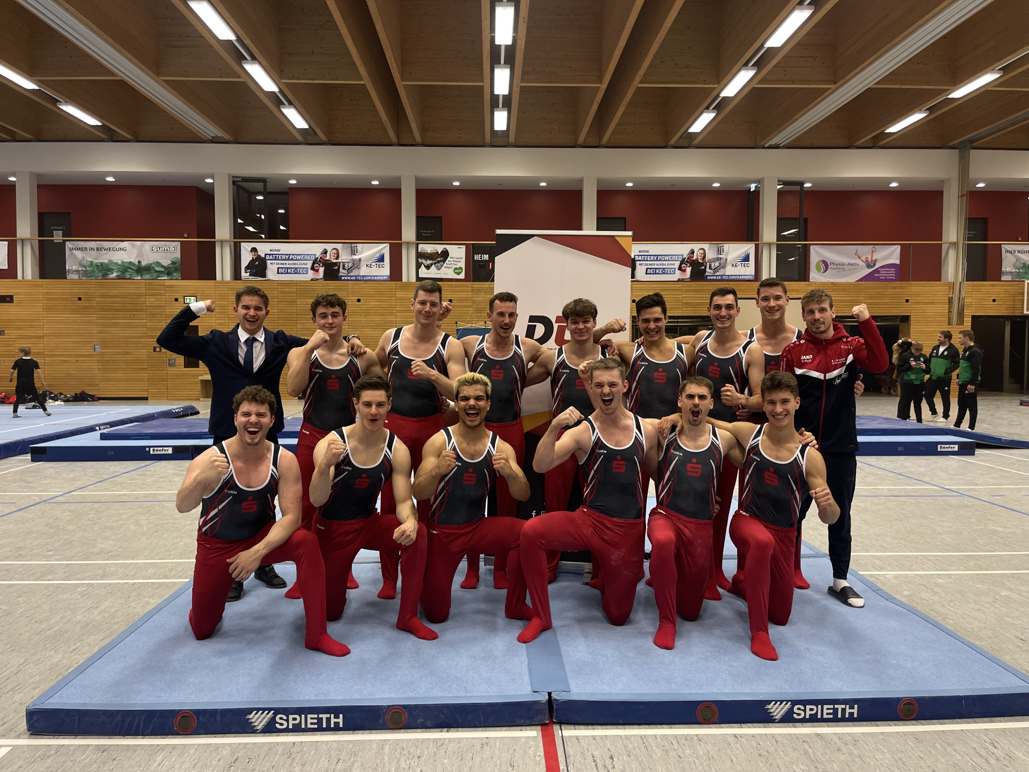 Auch am Sprung wusste die Mannschaft zu überzeugen. Neben den starken Nachwuchsturnern zeigte insbesondere der französische Turner Aaron Allemann einen gelungenen Auftritt und sammelte wichtige Punkte. Das vorletzte Gerät verlief auf beiden Seiten nahezu reibungslos, ehe es schließlich an das Königsgerät Reck ging. Dort präsentierten die jungen Turner Simon Kirchhübel und Nevio Hensel ansprechende Übungen und unterstrichen eindrucksvoll die positive Entwicklung des Teams. Die Routiniers standen dem in nichts nach: Mario Ostwald zeigte eine sehr saubere Übung und turnte seinen Doppelsalto-Abgang in den perfekten Stand. Dafür erhielt er den einzigen Bonus des Tages.
